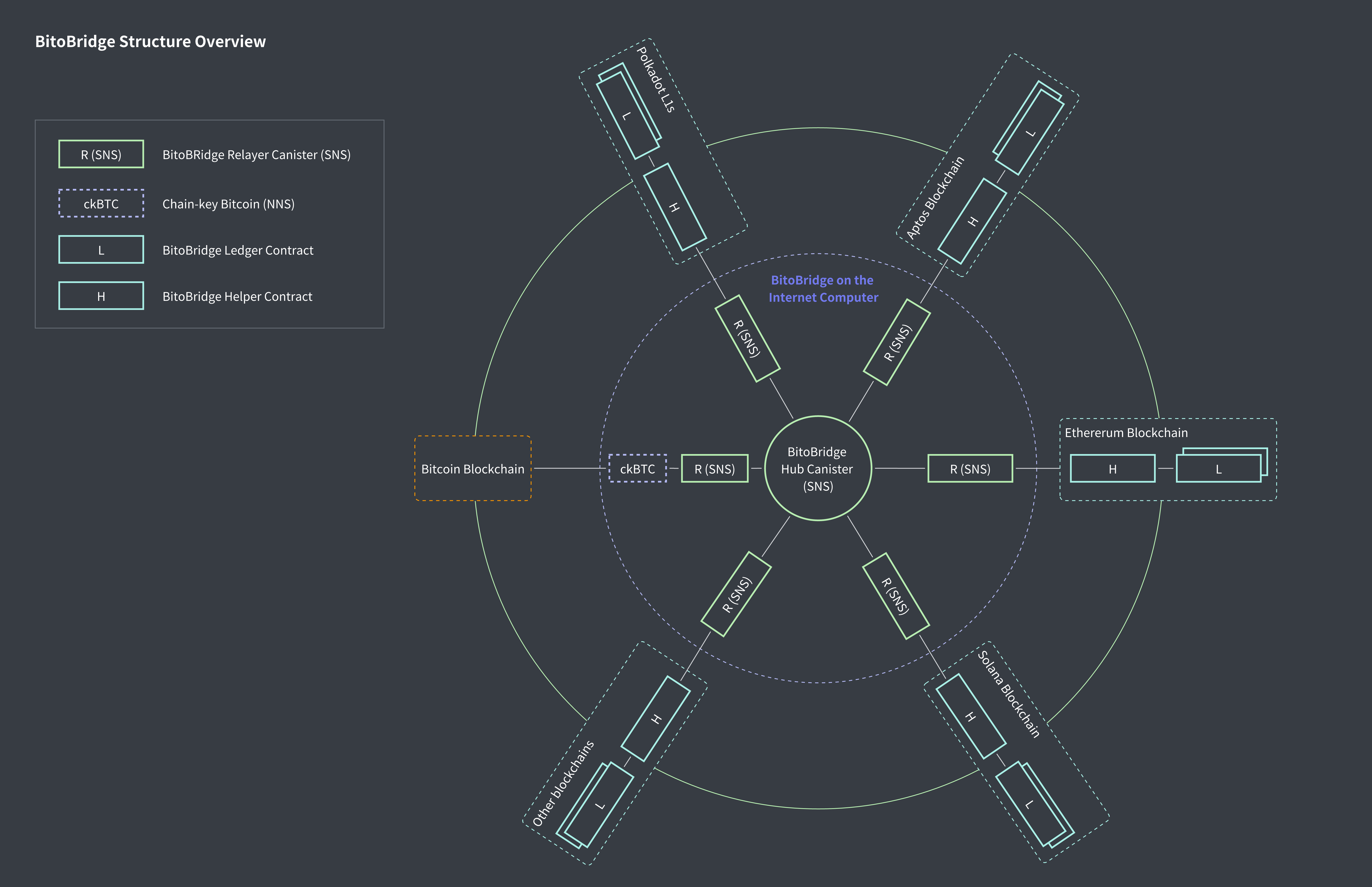 Several key components are connected to the Hub Canister, each playing a specific role in the overall architecture. The BitoBridge Relayer Canister (R) acts as a bridge, facilitating communication and transaction relaying between the Hub and external blockchains. Meanwhile, the [Chain-key Bitcoin](https://wiki.internetcomputer.org/wiki/Chain-key_Bitcoin) (ckBTC) component allows for secure interactions with the Bitcoin blockchain, integrating it directly into the IC framework without compromising on decentralization or security.